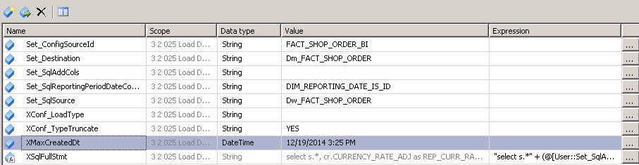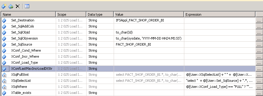 Add a new string variable named XConfLastMaxIncrLoadDtStr. The purpose with the variable is to store the value of the last saved max created timestamp of transactions transferred from IFS Applications database to the data warehouse for the current source.